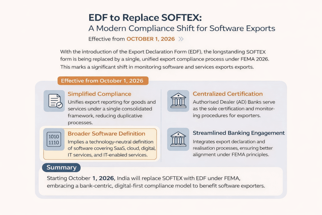 Disclaimer: This infographic is intended for informational and educational purposes only. It provides a high-level overview of the transition from SOFTEX to the Export Declaration Form (EDF) under the Foreign Exchange Management (Export and Import of Goods and Services) Regulations, 2026. The content does not constitute legal, regulatory, or professional advice. Exporters should refer to the applicable FEMA regulations, RBI notifications, and consult their Authorised Dealer Bank or professional advisor before taking any action based on this information.